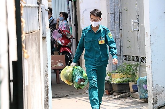 Sau một ngày “nội bất xuất, ngoại bất nhập”, vì người dân không thể đi ra ngoài và lực lượng thu gom rác thải cũng không được vào bên trong nên lượng rác dồn ứ rất nhiều. Để giải quyết vấn đề, các chiến sĩ dân quân đến từng nhà thu gom rác thải, chuyển từng bao rác ra xe, giúp cho môi trường sạch sẽ hơn. Các chiến sĩ chia sẻ: "Dịch bệnh thì ai cũng sợ, nhưng nếu mình thực hiện theo khuyến cáo của Bộ Y tế thì sẽ hạn chế được nguy cơ nhiễm bệnh. Chúng tôi không chỉ xem việc canh trực tại đây là một nhiệm vụ mà còn coi đây như là cơ hội để đóng góp công sức nhỏ bé của mình vào cuộc chiến đẩy lùi dịch bệnh".