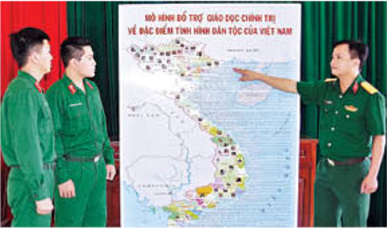 Sơ đồ sử dụng hình ảnh, âm thanh, chữ viết được thể hiện trên dạng hộp đèn. Theo đó, hình ảnh các dân tộc Việt Nam được in trên hình tấm bản đồ, một bên là hình ảnh còn một bên là chú thích các đặc điểm về các dân tộc, kết hợp với đèn LED và âm thanh để hiển thị nội dung cần giáo dục như: Tên dân tộc (các tên khác), nguồn gốc, ngôn ngữ; dân số; phân bố chủ yếu của các đồng bào dân tộc; đặc điểm về kinh tế, văn hóa của các dân tộc. Các nội dung này được bố trí trên 12 công tắc điều khiển, trong đó có 1 công tắc điều khiển sử dụng âm thanh, 11 công tắc điều khiển sử dụng đèn LED. Khi bật 1 công tắc điều khiển lên thì hình ảnh 5 dân tộc sẽ sáng, đồng thời 5 nội dung về đặc điểm của các dân tộc bên phần chú thích cũng sẽ tương ướng với màu sắc của đèn LED, cứ như vậy cho đến hết 11 công tắc điều khiển. Công tắc điều khiển âm thanh sẽ phát nội dung tuyên truyền, giáo dục được thu âm trước và lưu vào thẻ nhớ để phát ra loa cho bộ đội nghe kết hợp với quan sát trên sơ đồ.
