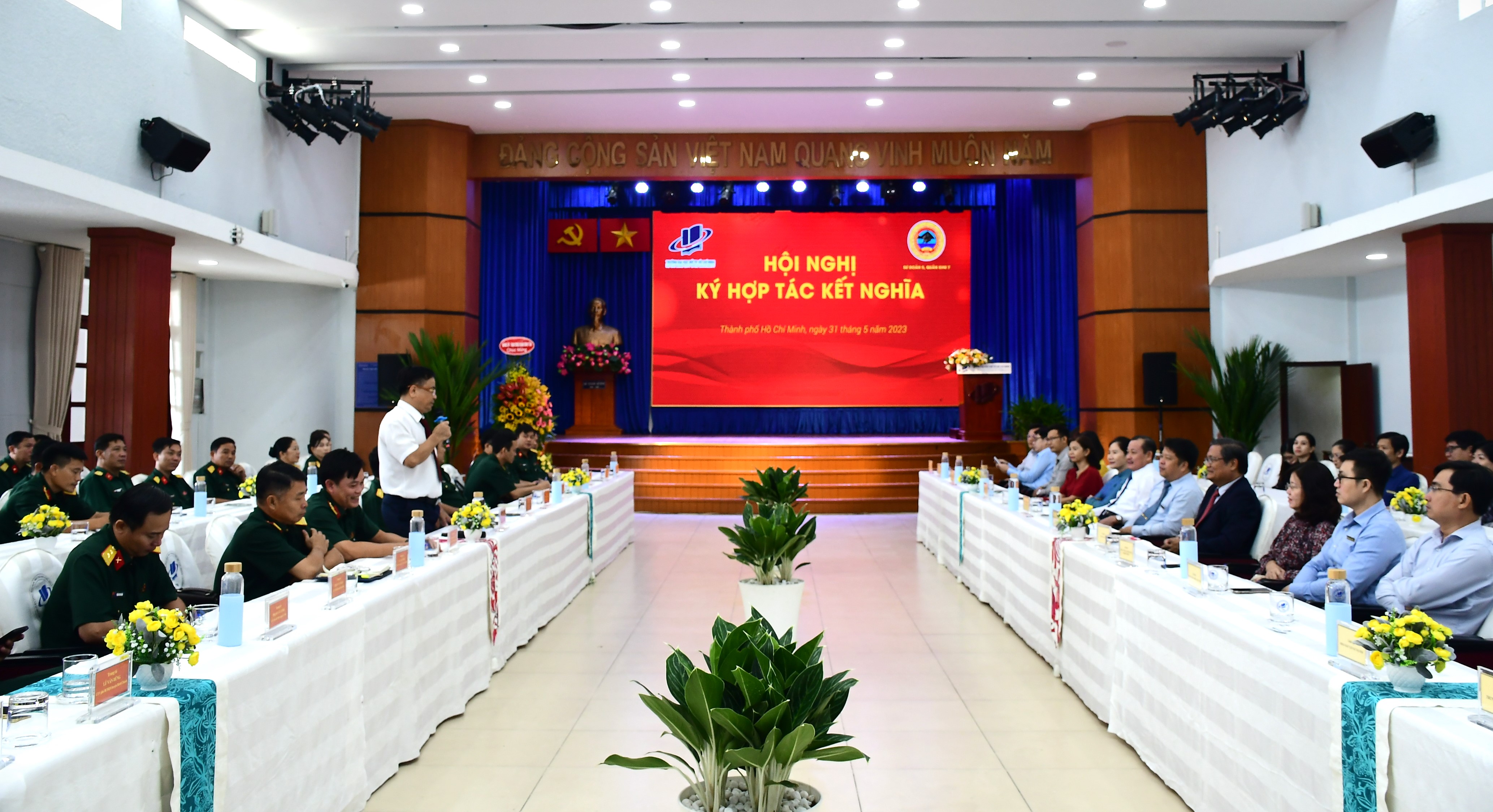 (QK7 Online) – Ngày 31/5, tại Thành phố Hồ Chí Minh, Sư đoàn 5 và Trường Đại học Mở Thành phố Hồ Chí Minh tổ chức ký hợp tác kết nghĩa. Dự ký kết nghĩa có TS. Đại tá Trần Đức Thắng, Phó Chủ nhiệm Chính trị Quân khu 7; Thượng tá Trần Hoàng Giang, Chính ủy Sư đoàn 5; GS.TS Nguyễn Minh Hà, Hiệu trưởng Trường Đại học Mở Thành phố Hồ Chí Minh; đại diện Trường Quân sự Quân khu 7, Bộ Tư lệnh Thành phố Hồ Chí Minh và Ban Chỉ huy Quân sự các quận, huyện kết nghĩa với Trường Đại học Mở Thành phố Hồ Chí Minh.