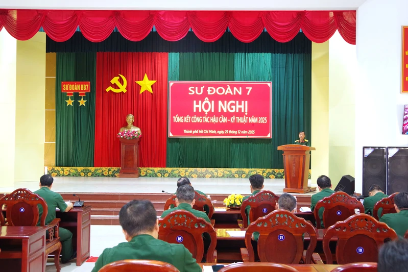 (QK7 Online) - Chiều 29/12, Sư đoàn 7 tổ chức tổng kết công tác Hậu cần-Kỹ thuật (HC-KT) năm 2025. Hội nghị là dịp đánh giá toàn diện những ưu điểm, khuyết điểm, bài học kinh nghiệm các nội dung bảo đảm (HC-KT) trong năm của Sư đoàn, đồng thời định hướng tổ chức bảo đảm thời gian tiếp theo. Đại tá Nguyễn Danh Tâng, Phó Sư đoàn trưởng Sư đoàn 7 dự, chỉ đạo hội nghị.