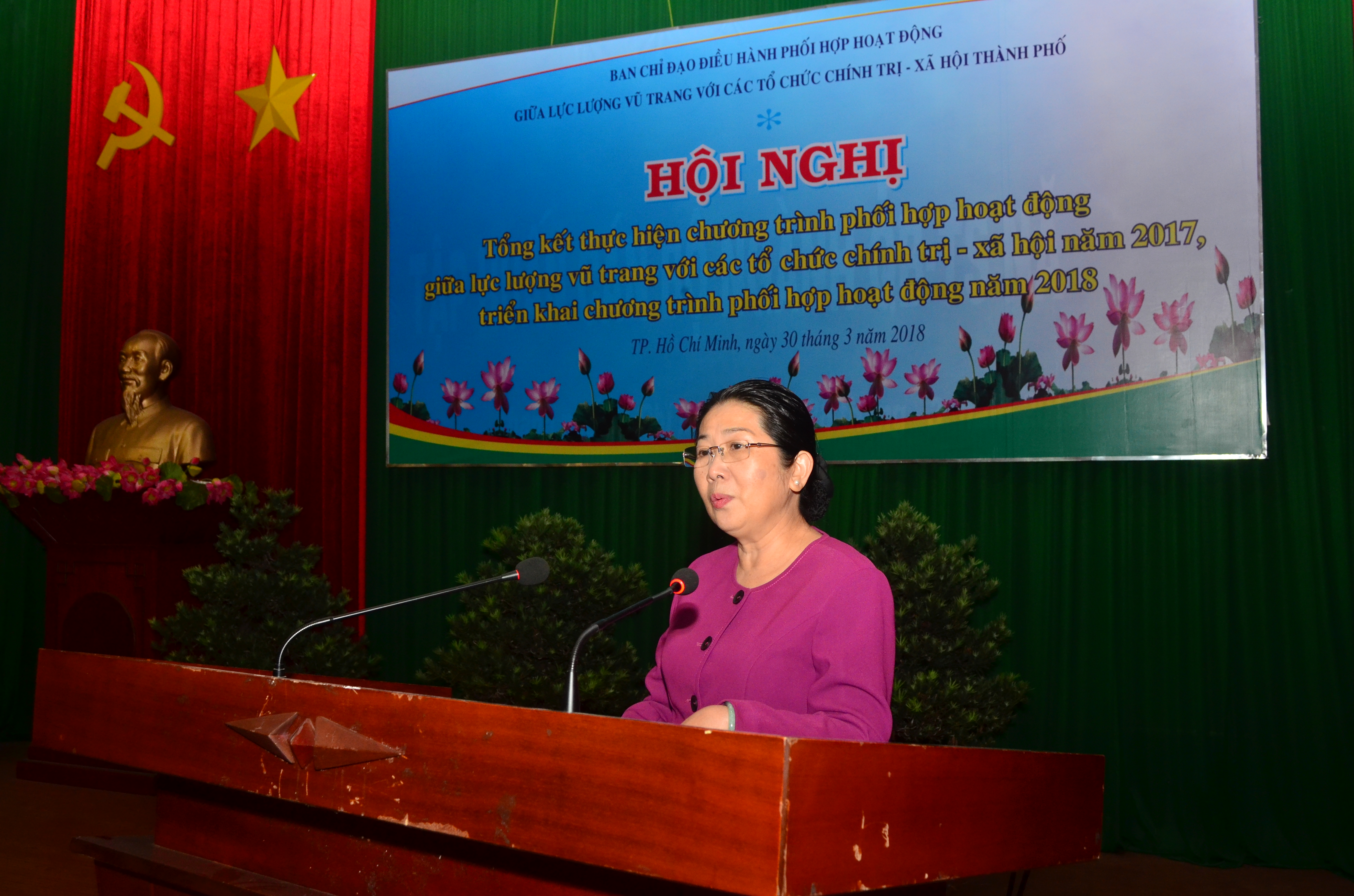 Hội nghị đã dánh giá năm 2017, lực lượng vũ trang và các tổ chức chính trị - xã hội Thành phố Hồ Chí Minh đã tổ chức thực hiện tốt nội dung, chương trình phối hợp hoạt động đã đề ra. Trong đó nổi bật là: tuyên truyền cho cán bộ, chiến sĩ lực lượng vũ trang, đoàn viên, hội viên và Nhân dân thực hiện tốt đường lối chủ trương của Đảng, chính sách, pháp luật của Nhà nước, nâng cao ý thức cảnh giác, đấu tranh với các luận điệu phản động của các thế lực thù địch; Củng cố tăng cường quốc phòng an ninh, xây dựng lực lượng vũ trang, xây dựng cơ sở địa phương vững mạnh toàn diện; Thực hiện chính sách quân đội, hậu phương quân đội và chính sách xã hội của Ban chỉ đạo điều hành phối hợp hoạt động đạt hiệu quả cao thông qua các hoạt động góp phần giáo dục đoàn viên, hội viên về lòng nhân ái, truyền thống “Uống nước nhớ nguồn”, đền ơn đáp nghĩa.