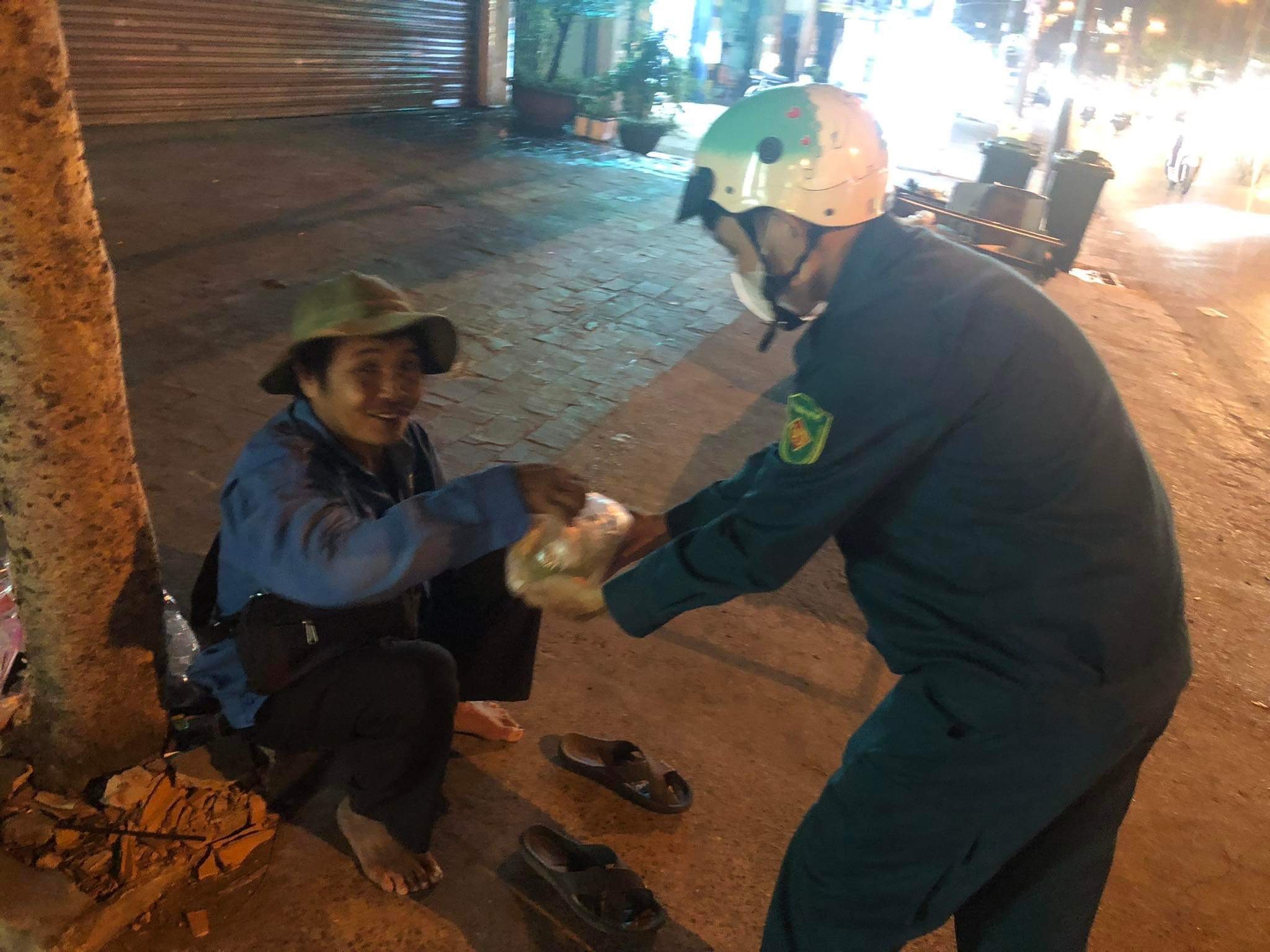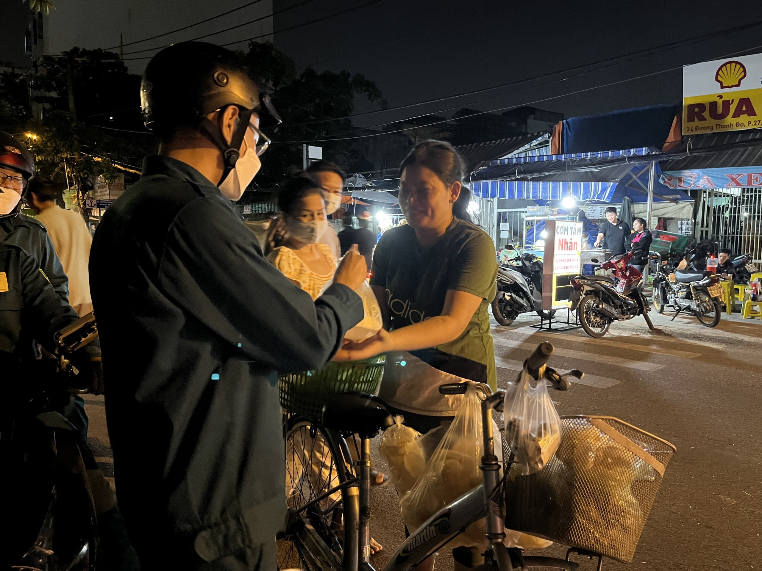 Cán bộ, chiến sĩ LLVT Phường 27, Bình Thạnh trao suất cơm cho người dân.