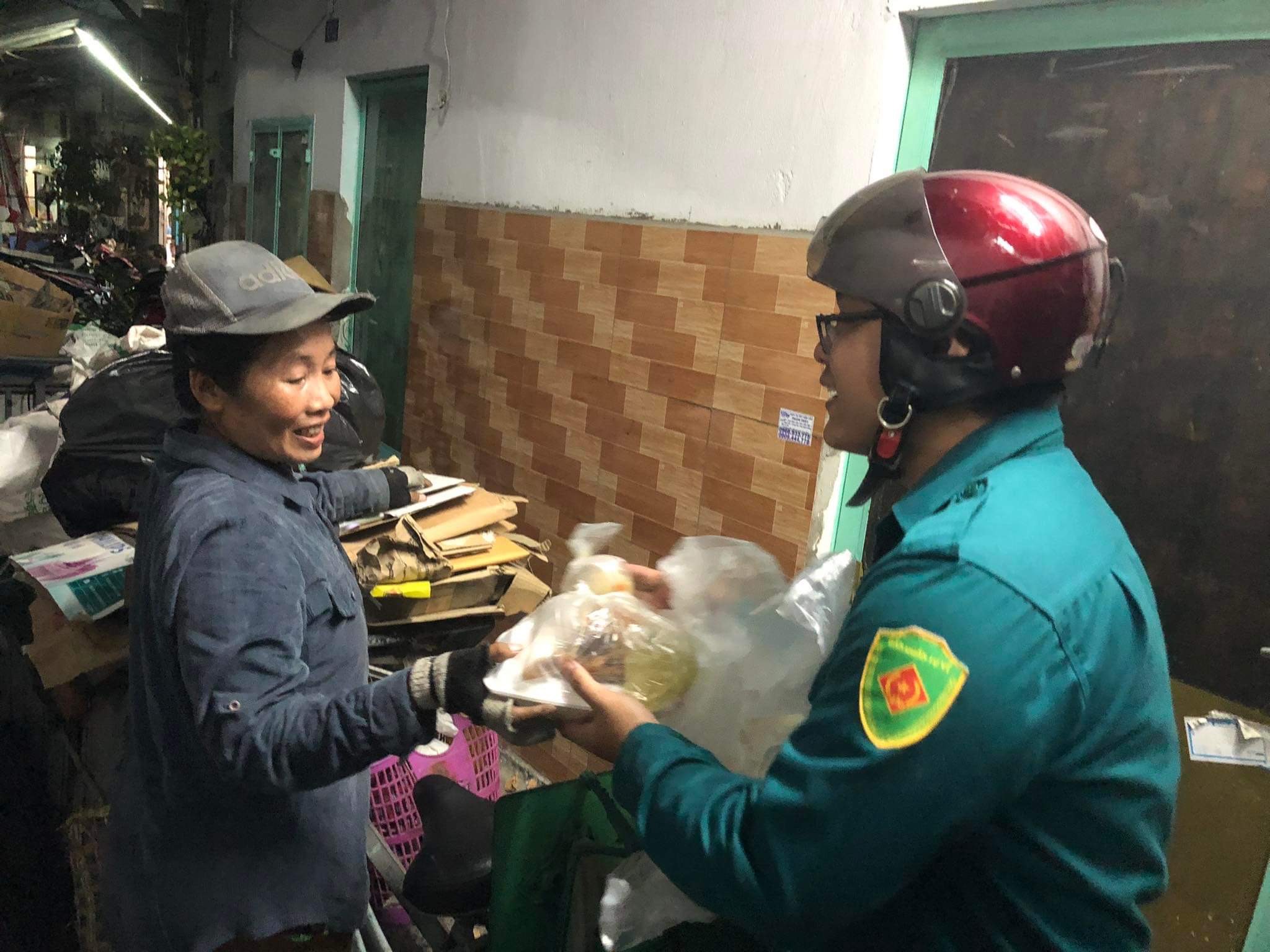 Dân quân Phường 27, Bình Thạnh trao suất cơm cho người dân.