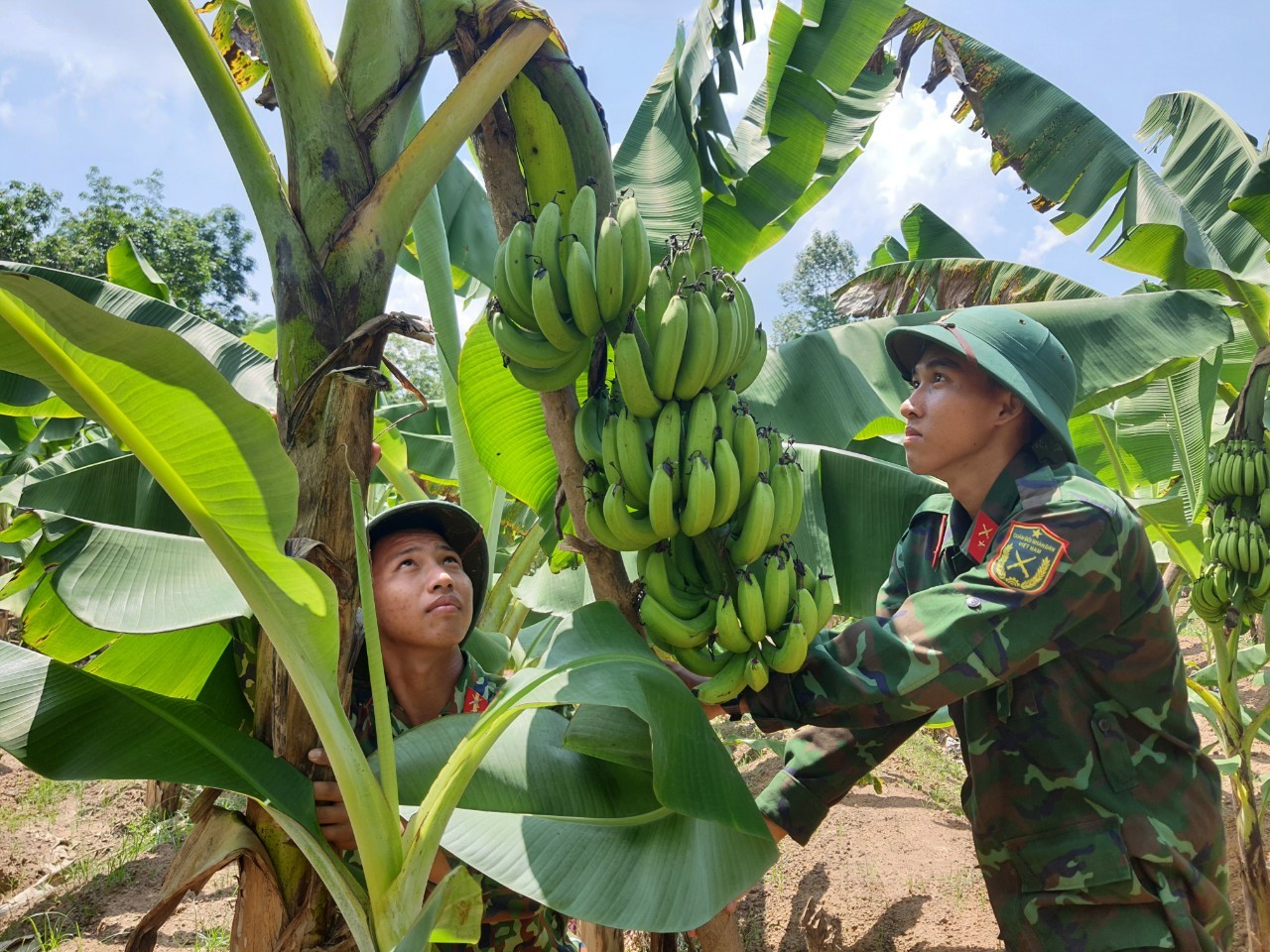 Chiến sĩ Trung đoàn 271 chăm sóc vườn cây ăn trái.