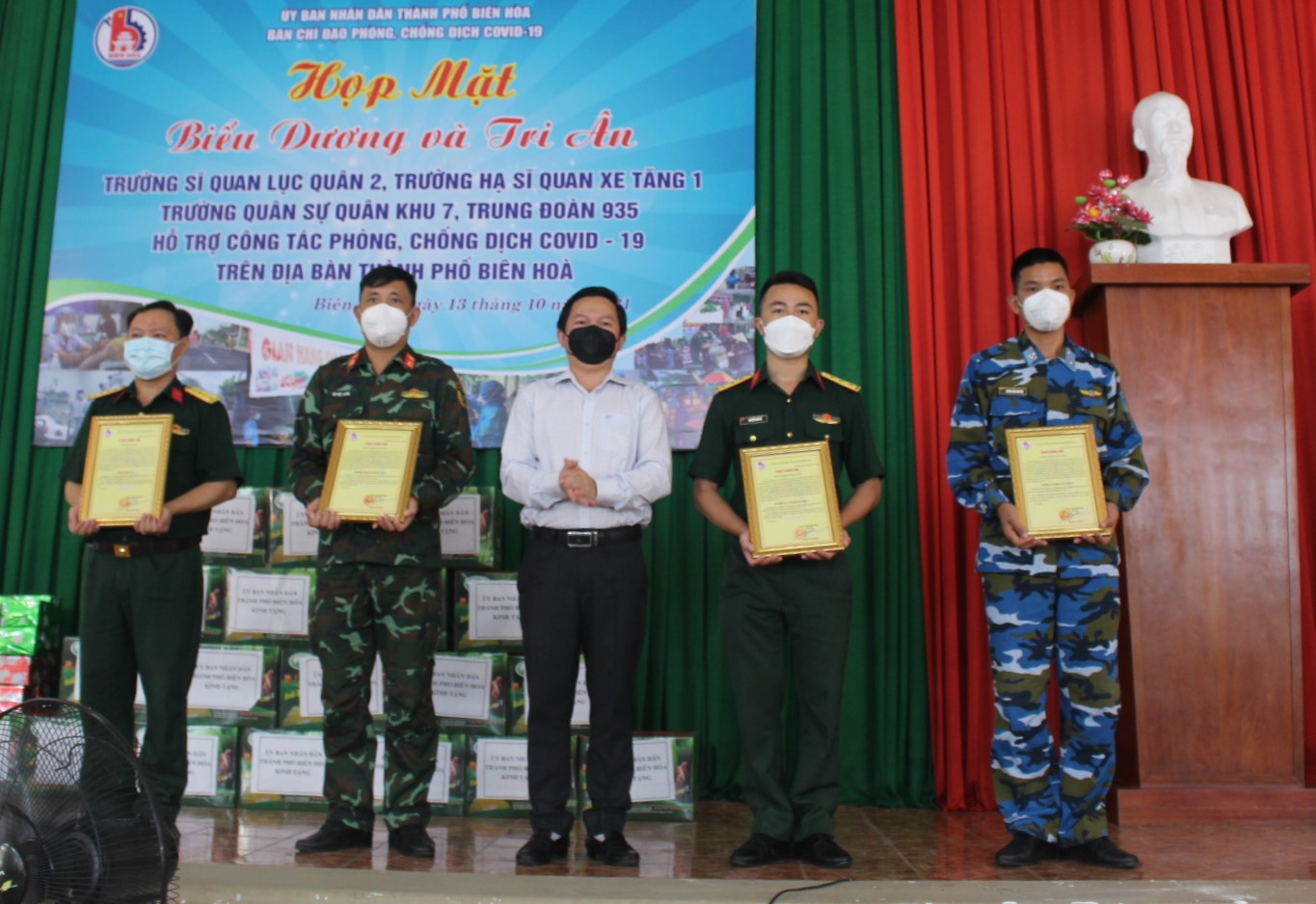 Dịp này, lãnh đạo thành phố Biên Hòa trao thư tri ân cho 4 đơn vị và nhiều phần thưởng cho cán bộ, chiến sĩ các đơn vị đến hỗ trợ thành phố chống dịch Covid-19.