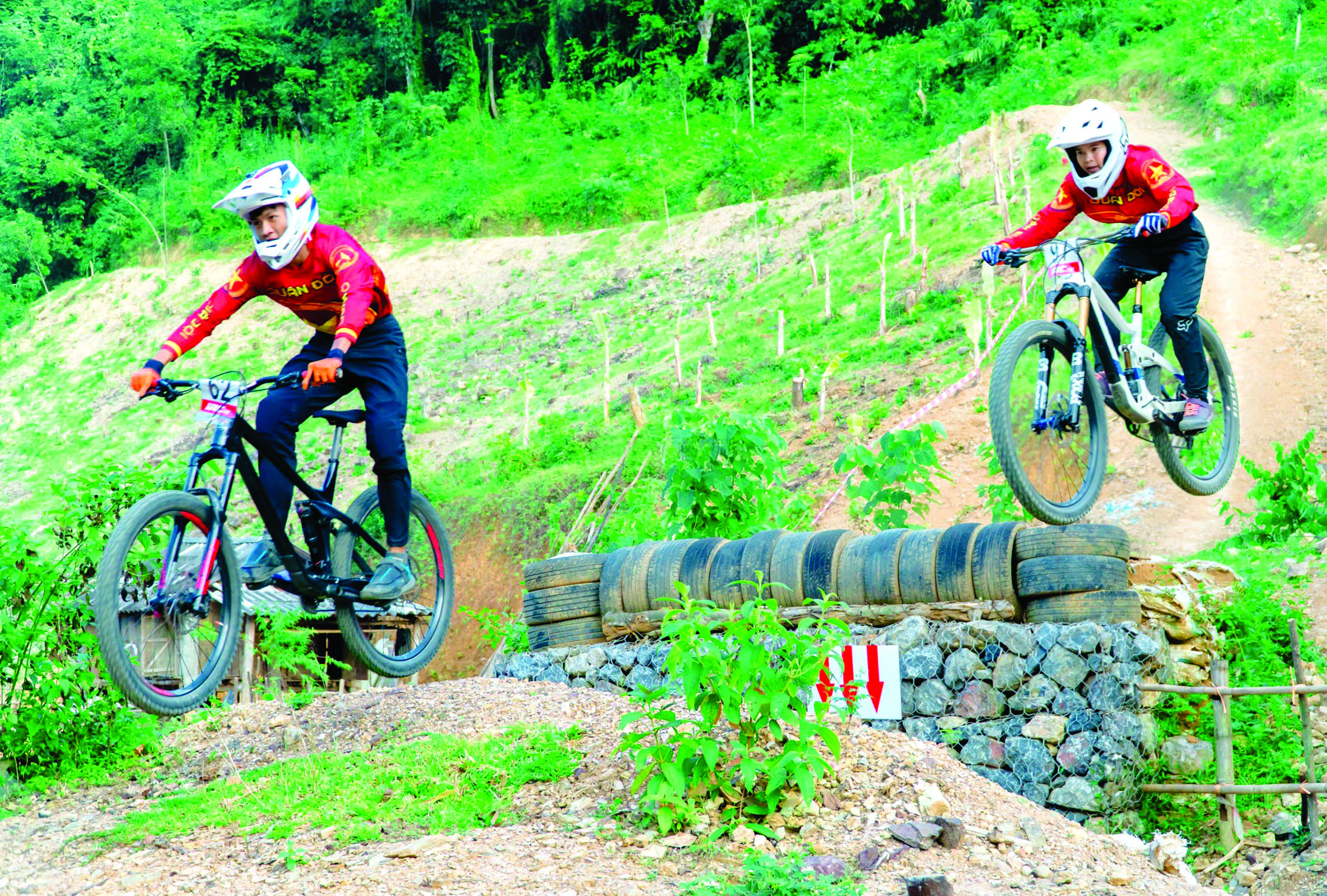 Vận động viên Quàng Thị Soan (bên phải) và vận động viên Nguyễn Hữu Thành đạt Huy chương Vàng nội dung đổ đèo tại giải Vô địch toàn quốc năm 2023. Ảnh: XT