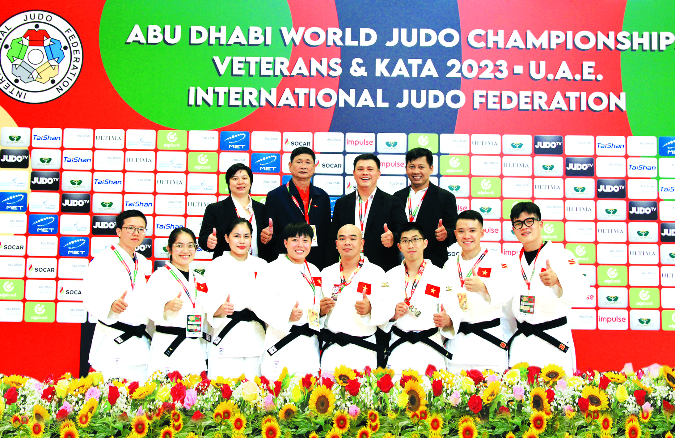 Đại tá Hồ Châu Tuấn, Giám đốc Trung tâm TDTT Quốc phòng II (thứ 2, hàng thứ 2 bên trái ) cùng các HLV-VĐV Đội Judo tại giải Vô địch thế giới năm 2023. Ảnh: DT