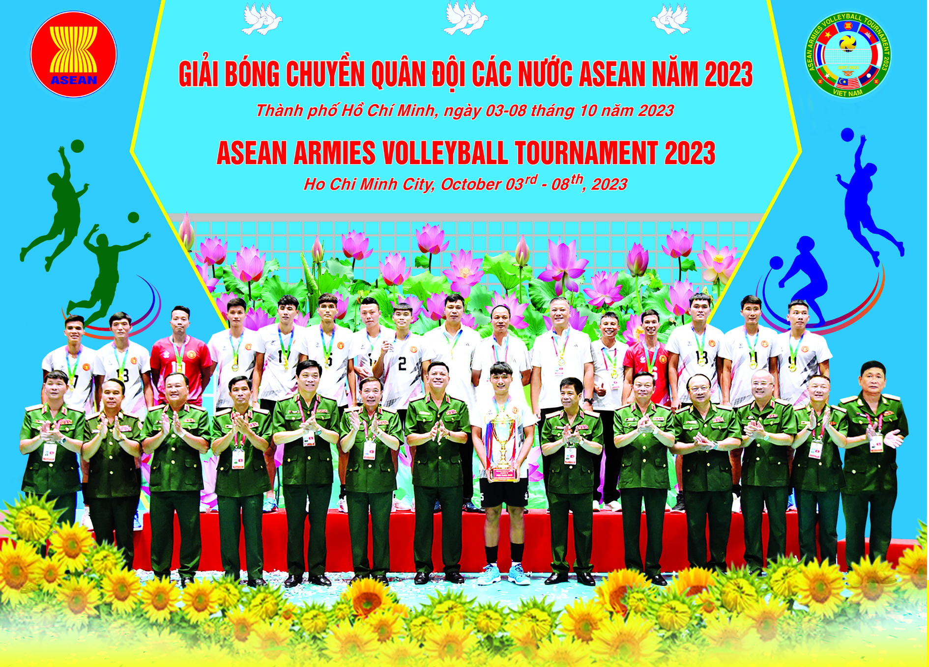 Thủ trưởng Bộ tổng Tham mưu và Bộ Tư lệnh Quân khu chúc mừng Đội tuyển bóng chuyền nam Quân đội QĐND Việt Nam đạt giải Nhất tại Giải bóng chuyền nam Quân đội các nước ASEAN năm 2023. Ảnh: Lê Hoan