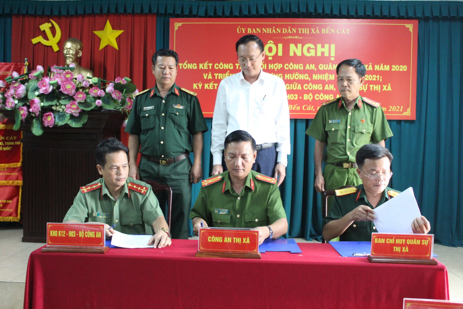 Trong năm qua, CA TX.Bến Cát phối hợp với Ban Chỉ huy Quân sự (CHQS) thị xã tham mưu cho Thị ủy, UBND thị xã triển khai các kế hoạch trọng tâm nhằm giữ vững ANTT trên địa bàn. Đồng thời, hai đơn vị đã quán triệt các nội dung, nhiệm vụ thực hiện cho từng cán bộ, chiến sĩ trong đơn vị. Định kỳ, Đội Tổng hợp CA thị xã và Ban Tham mưu Ban CHQS thị xã trao đổi tình hình, kết quả thực hiện nhiệm vụ bảo đảm an ninh chính trị, trật tự an toàn xã hội trên địa bàn nhằm phục vụ cho kế hoạch giao ban giữa các ngành do cấp ủy Đảng chủ trì. Khi xảy ra vụ việc đột xuất, hai đơn vị kịp thời thông tin, trao đổi cho nhau và chỉ đạo cấp cơ sở phối hợp giải quyết theo chức năng, nhiệm vụ được giao.