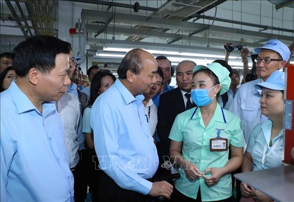 Thủ tướng Nguyễn Xuân Phúc trò chuyện với công nhân Công ty TNHH Điện tử Foster (Bắc Ninh). Ảnh: TTXVN.