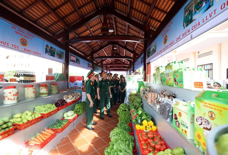 Thượng tướng Nguyễn Trường Thắng kiểm tra khu vực trưng bày sản phẩm tăng gia sản xuất tại Sư đoàn 5.