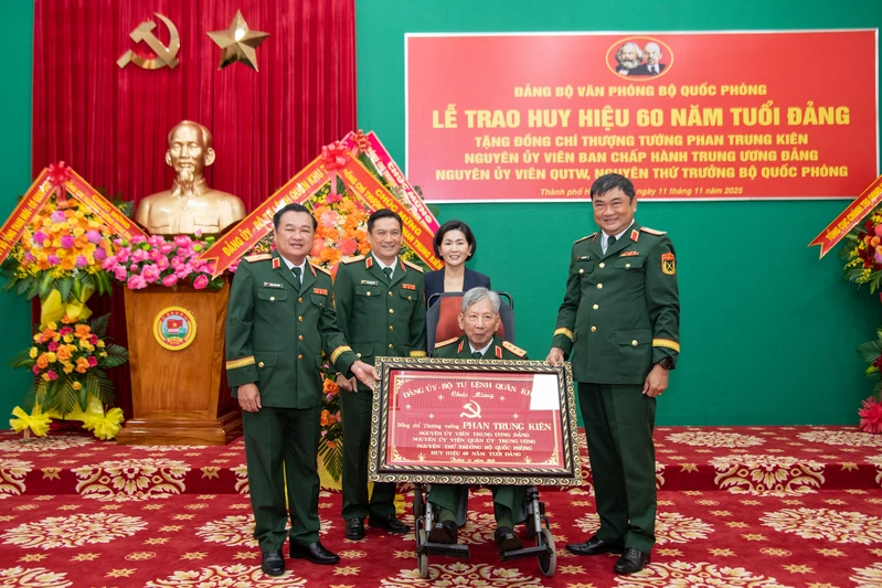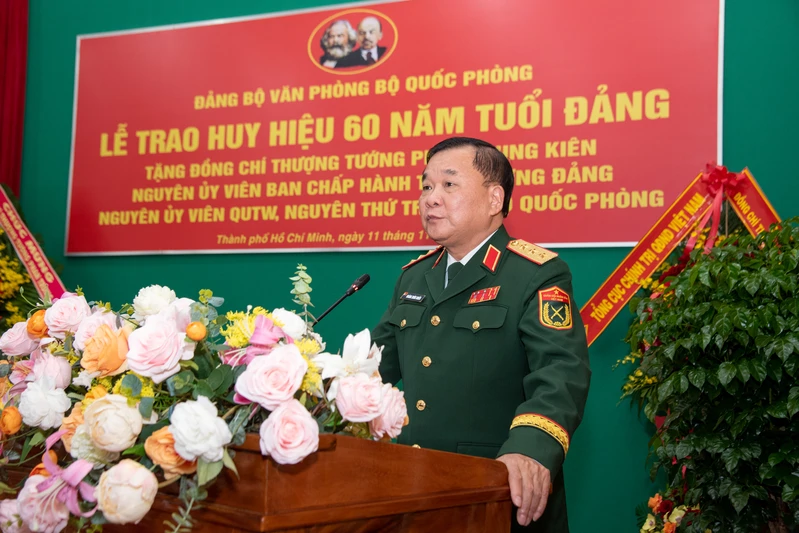 (QK7 Online) - Sáng 11 tháng 11, tại Thành phố Hồ Chí Minh, Đảng bộ Văn phòng Bộ Quốc phòng tổ chức Lễ trao Huy hiệu 60 năm tuổi Đảng tặng đồng chí Thượng tướng Phan Trung Kiên, nguyên Ủy viên Ban Chấp hành Trung ương Đảng, nguyên Ủy viên Quân ủy Trung ương, nguyên Thứ trưởng Bộ Quốc phòng.