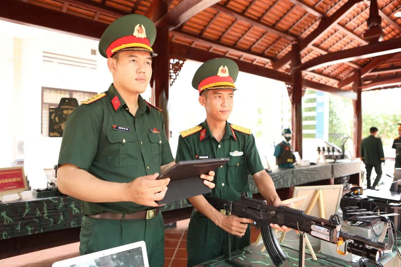Thượng úy Nguyễn Duy Anh (bên trái) hướng dẫn sử dụng "Thiết bị luyện tập bắn súng ứng dụng AI camera DA01" tại khu trưng bày sản phẩm huấn luyện của Sư đoàn 5.
