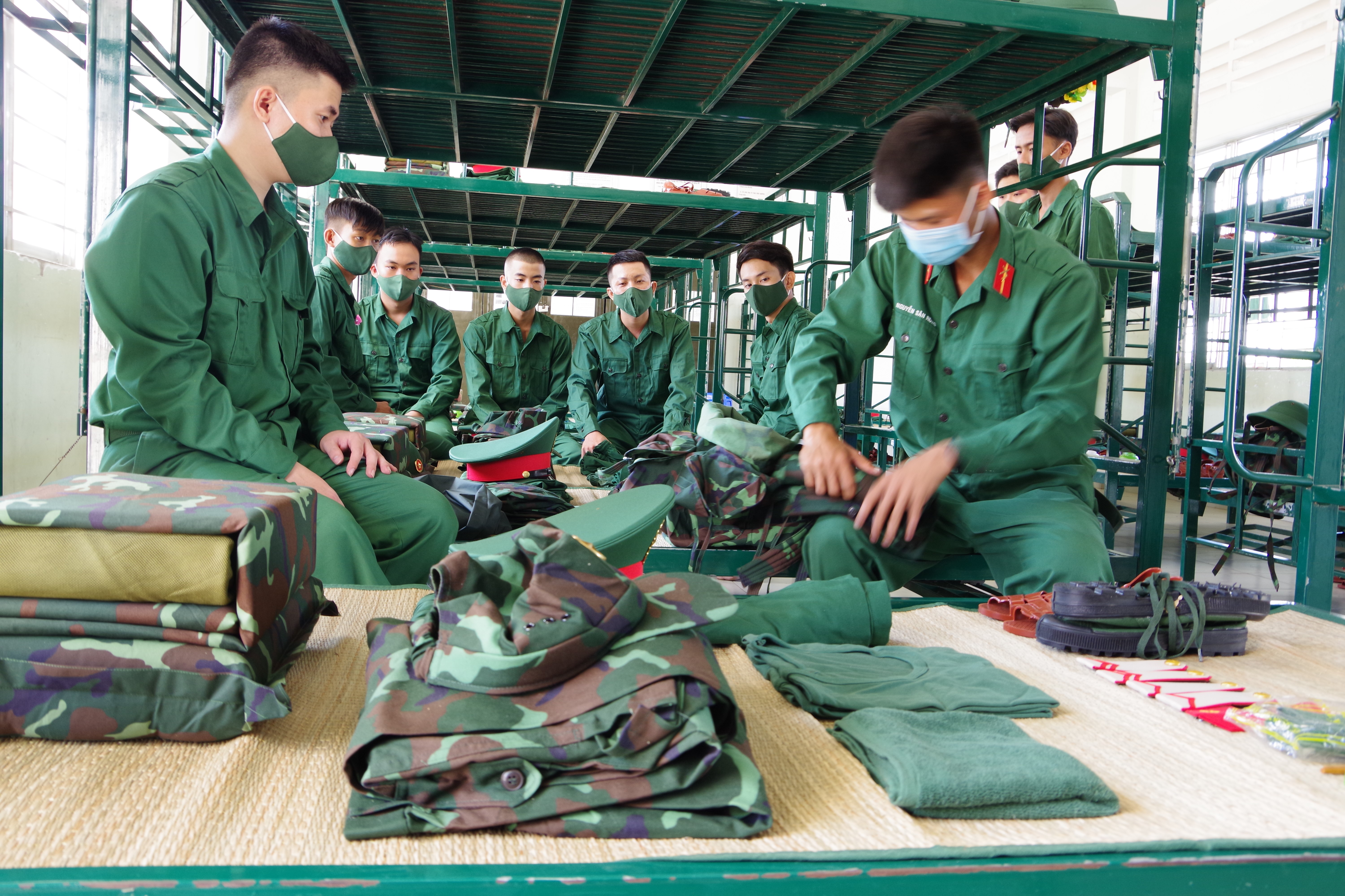 Tiểu đội trưởng hướng dẫn chiến sĩ mới sắp xếp quân tư trang khi vừa bước vào đơn vị.