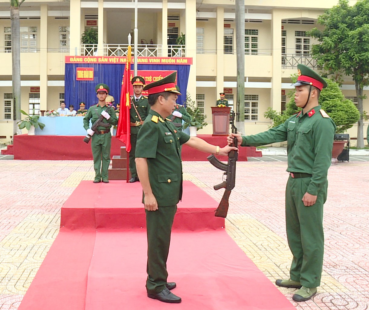 Chỉ huy Trung đoàn 6 trao súng cho chién sĩ mới.