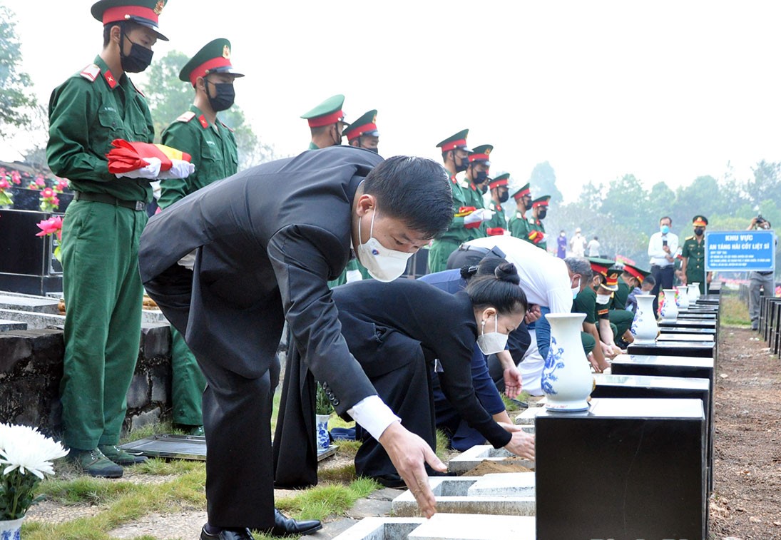 Sau lễ viếng, lãnh đạo tỉnh thực hiện lễ an táng hài cốt 6 liệt sĩ vừa được tìm kiếm và quy tập trên địa bàn tỉnh về lòng đất mẹ.