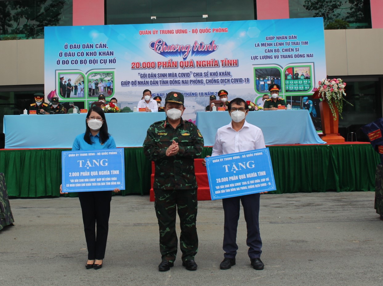 Thiếu tướng Lê Hồng Dũng, Phó chủ nhiệm Tổng cục Hậu cần Quân đội Nhân dân Việt Nam trao tặng bảng tượng trưng 20.000 phần quà của Quân ủy Trung ương giúp đỡ nhân dân tỉnh Đồng Nai.