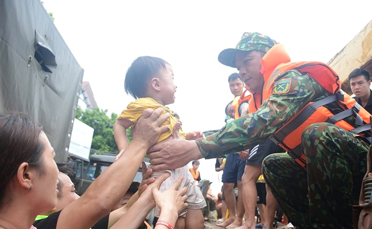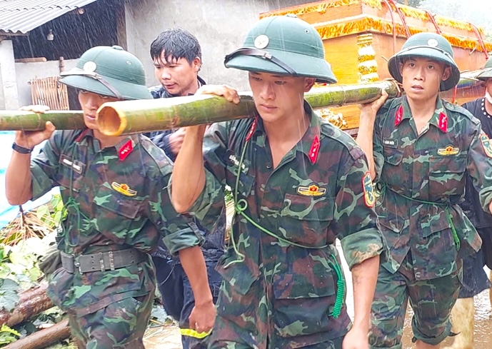 “Yên tâm, bộ đội đến rồi…”, một tiếng nhẹ lòng của người dân vùng lũ. Dù trong đêm tối hay giữa dòng nước lũ, cán bộ chiến sĩ vẫn vội vàng chèo xuồng đến từng nhà, trèo tường để đỡ từng người dân, nhất là người già, trẻ em xuống, đưa đến nơi an toàn. Sau khi chở người dân ra khỏi vùng lũ, bộ đội lại dầm mình đẩy thuyền chở theo cơm, lương thực, thực phẩm, nước sạch vào cho người dân. Các anh đã trở thành chỗ dựa vững chắc của Nhân dân trong thiên tai. Những khoảnh khắc đầy nghĩa tình ấy đã chạm đến trái tim của hàng triệu đồng bào.