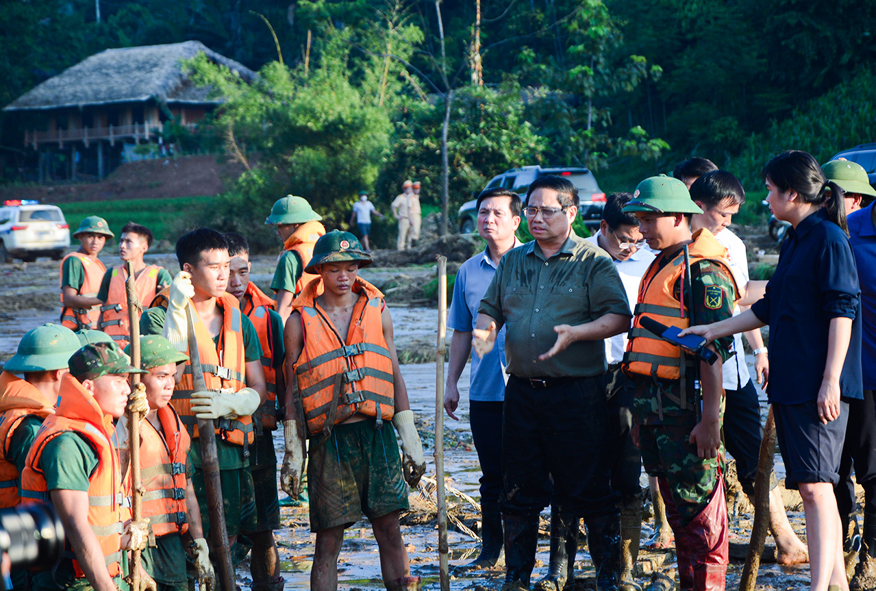 Thủ tướng Chính phủ Phạm Minh Chính động viên lực lượng tìm kiếm nạn nhân tại thôn Làng Nủ.