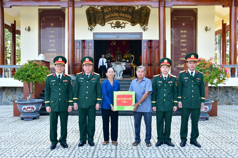 Đại tá Thái Thành Đức, Phó Chủ nhiệm Chính trị Quân khu (thứ hai bên trái sang) tặng quà của Ban chỉ đạo 515 Quân khu cho Ban quản lý Nghĩa trang liệt sĩ Vĩnh Hưng - Tân Hưng.