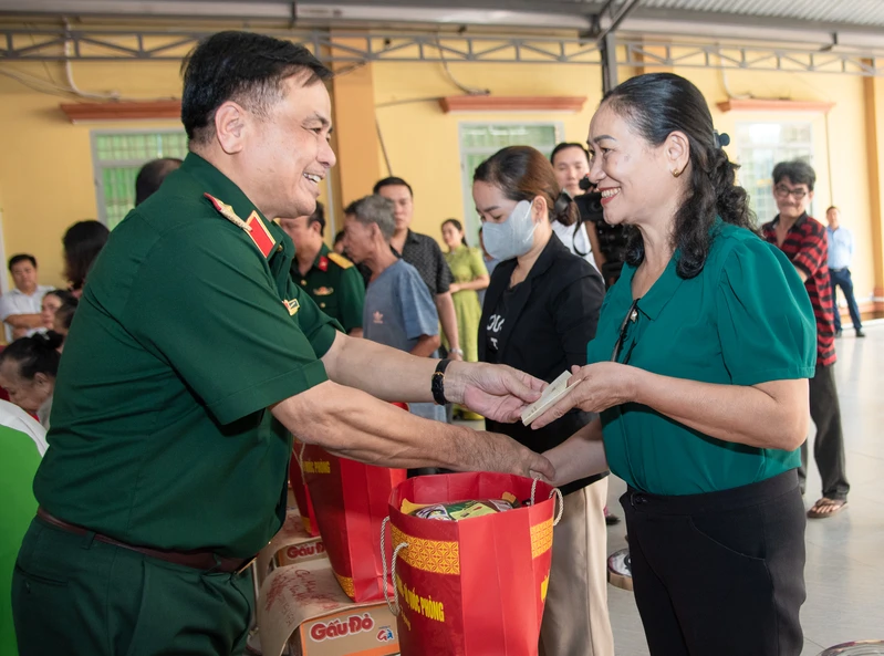 Thiếu tướng Trần Đức Thắng, Phó Chủ nhiệm Chính trị Quân khu tặng quà cho gia đình chính sách xã Phước Thành.