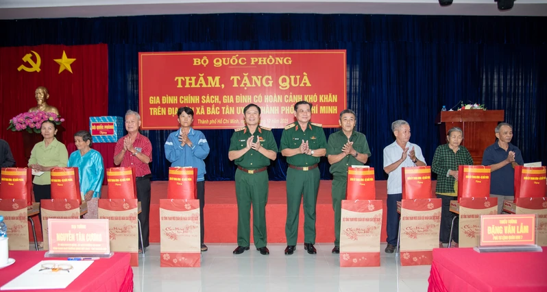 Đại tướng Nguyễn Tân Cương và Thiếu tướng Đặng Văn Lẫm tặng quà cho các gia đình chính sách, gia đình khó khăn xã Bắc Tân Uyên.