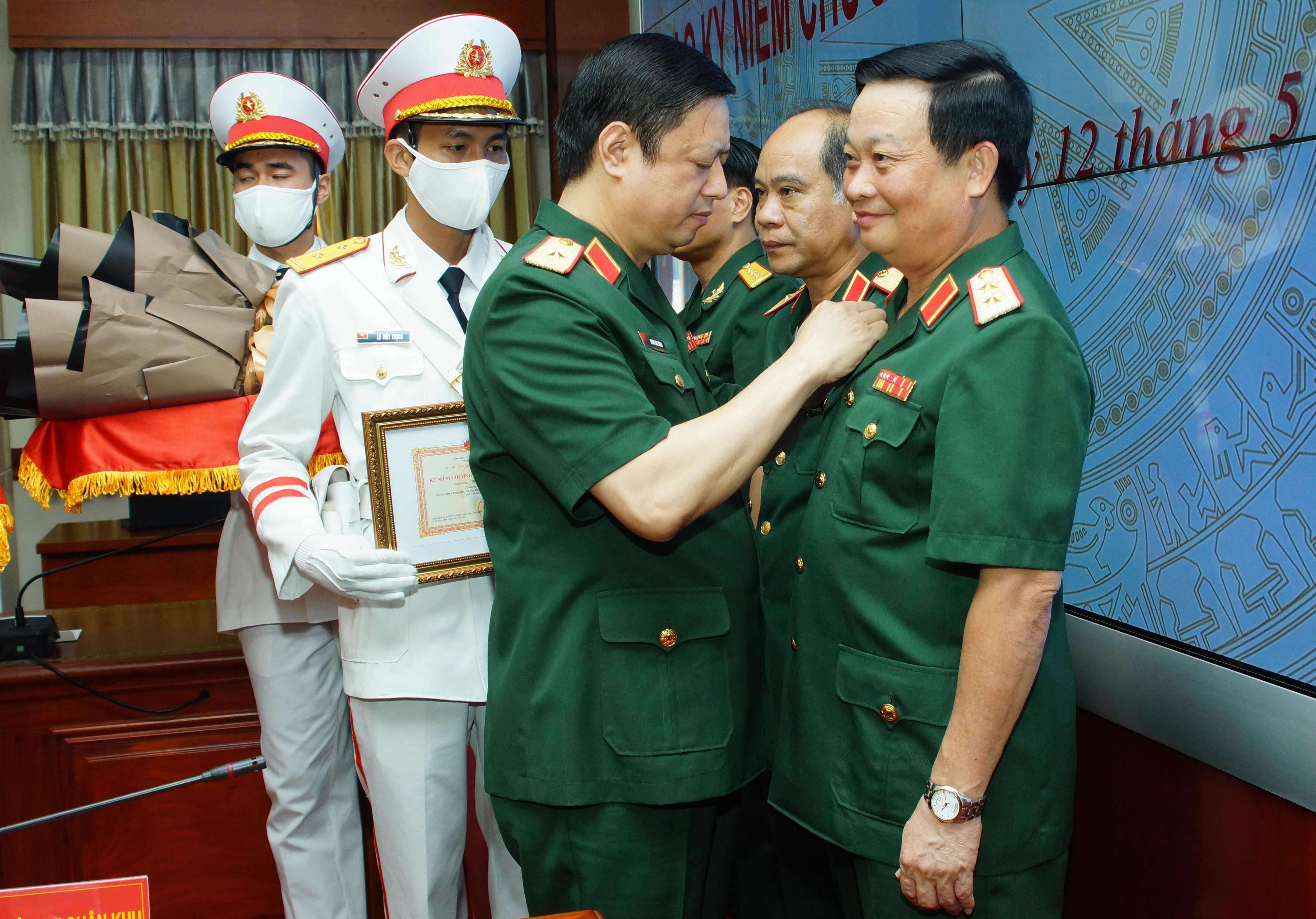 Thiếu tướng Dương Văn Thăng đeo kỷ niệm chương cho Trung tướng Trần Hoài Trung.