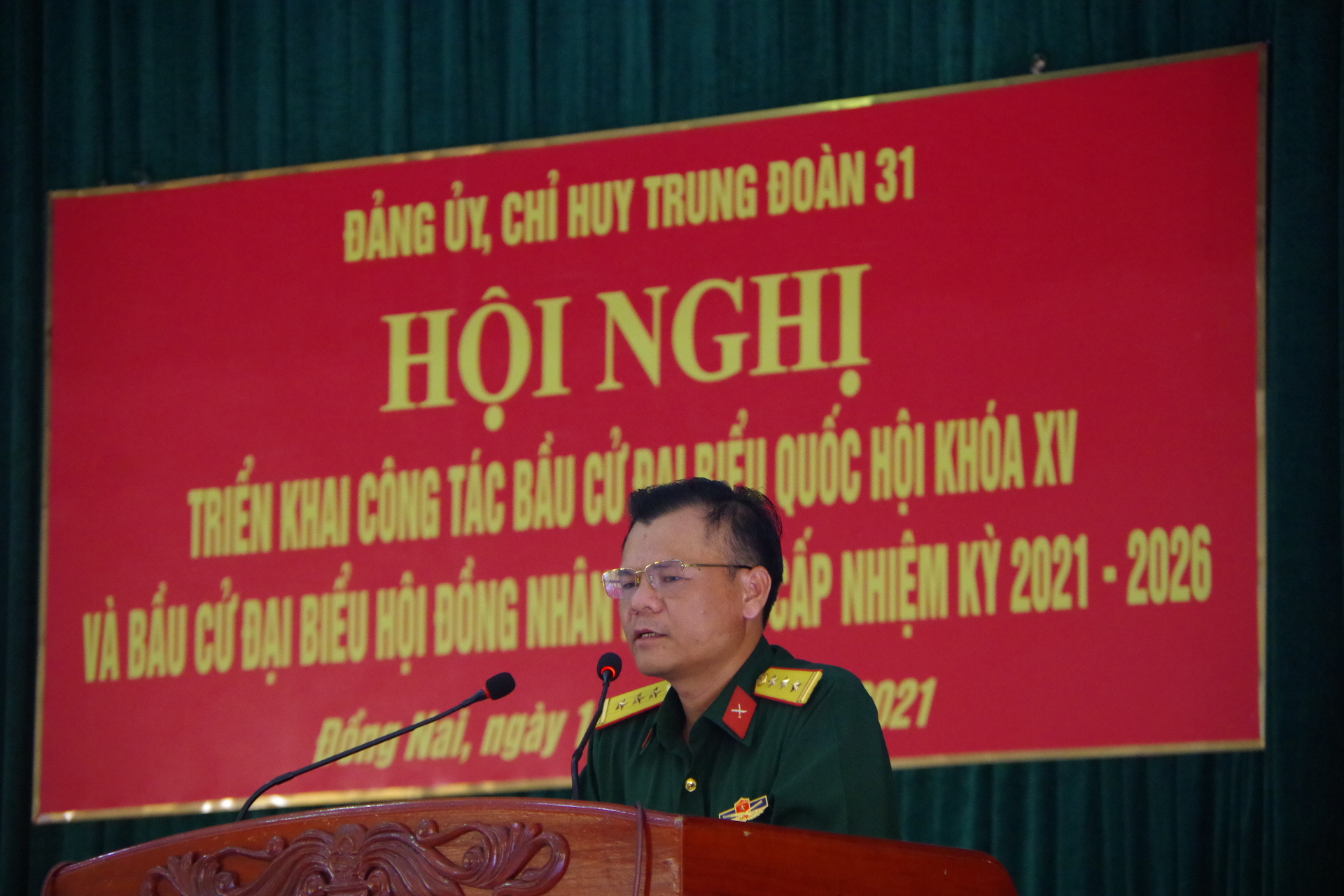 Tại Hội nghị đồng chí Thượng tá Nguyễn Tuấn Tài – Bí thư Đảng ủy, Chính ủy Trung đoàn đã nhấn mạnh mục đích, ý nghĩa tầm quan trọng của Cuộc bầu cử đại biểu Quốc hội khóa XV và bầu cử HĐND các cấp nhiệm kỳ 2021- 2026, theo đồng chí: Đây là sự kiện chính trị to lớn, có ý nghĩa rất quan trọng của đất nước và là ngày hội lớn để nhân dân phát huy quyền làm chủ, trực tiếp lựa chọn, giới thiệu và bầu ra những người tiêu biểu về đức, tài, xứng đáng đại diện cho ý chí, nguyện vọng và quyền làm chủ của nhân dân trong Quốc hội và HĐND các cấp.