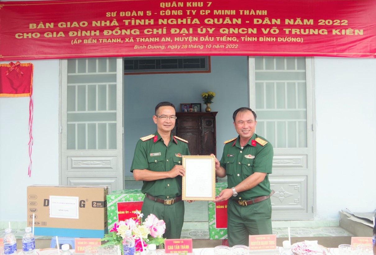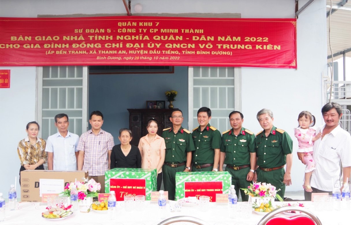 (QK7 Online) - Ngày 28/10, Trung đoàn 5, Sư đoàn 5 phối hợp với cấp ủy, chính quyền xã Thanh An, huyện Dầu Tiếng, tỉnh Bình Dương tổ chức bàn giao “Nhà tình nghĩa quân - dân” cho gia đình Đại úy QNCN Võ Trung Kiên, Nhân viên Văn hóa, Ban Chính trị, Trung đoàn 5, Sư đoàn 5.
