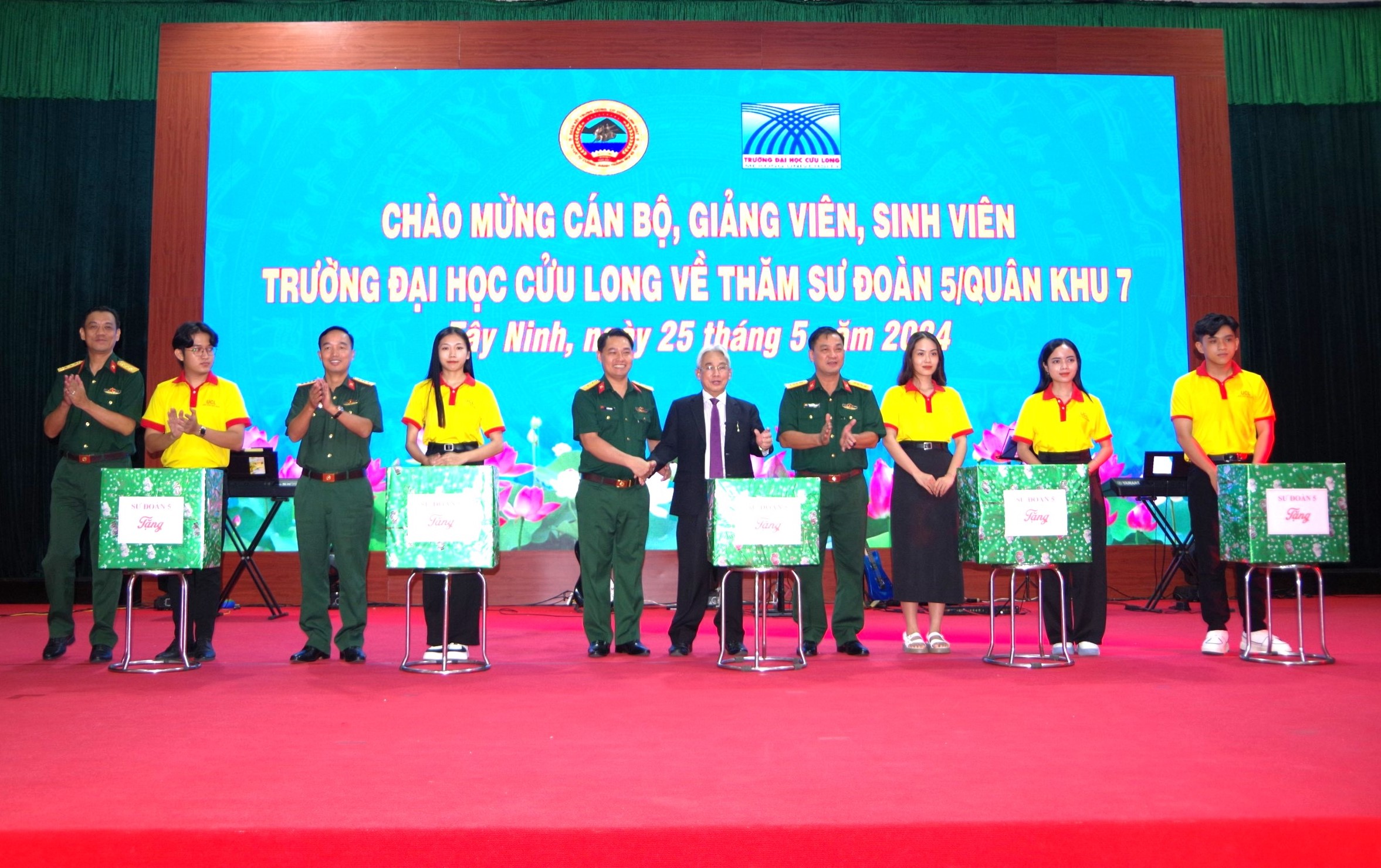 Sư đoàn 5 tặng quà cho lãnh đạo, giảng viên, sinh viên Trường Đại học Cửu Long.