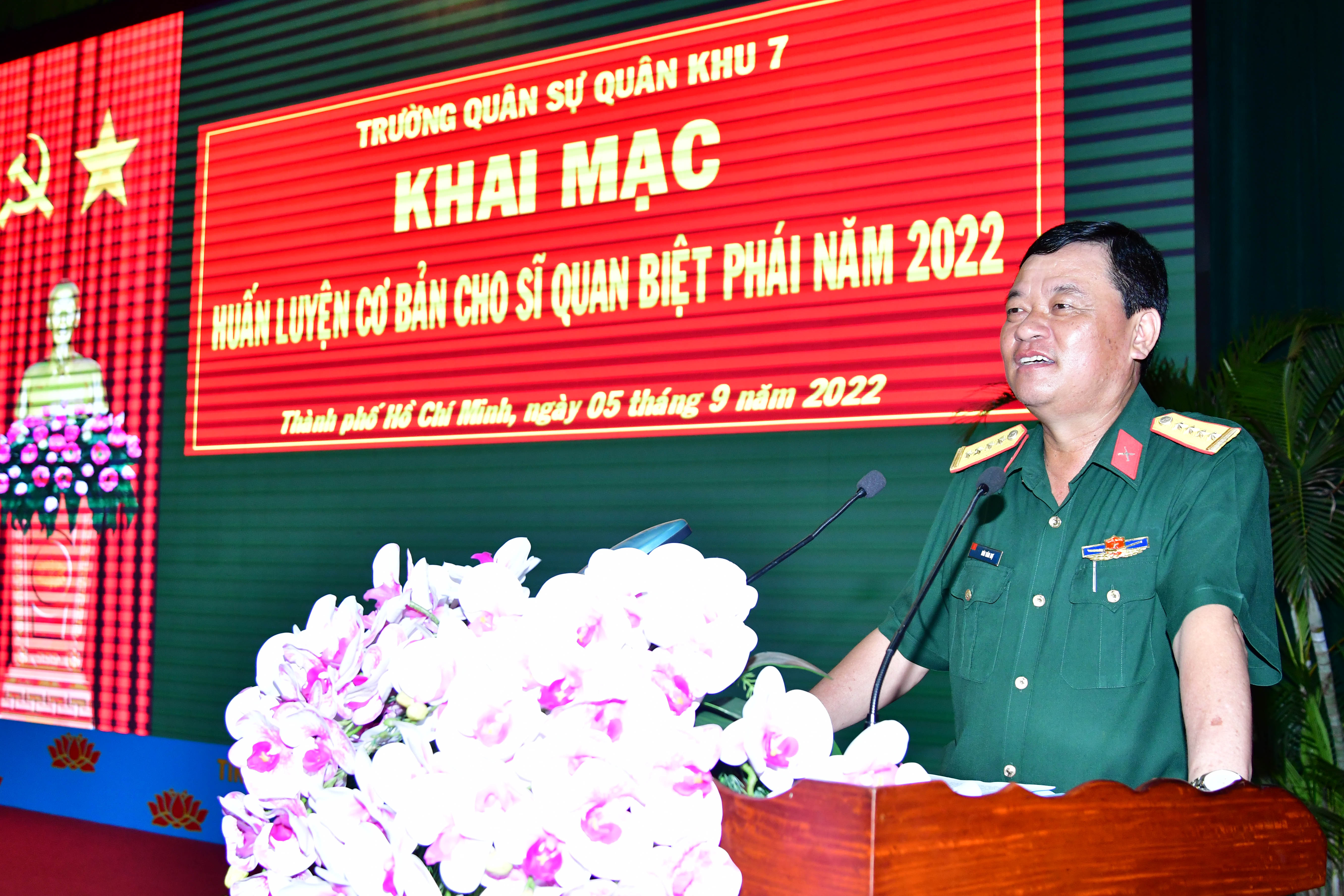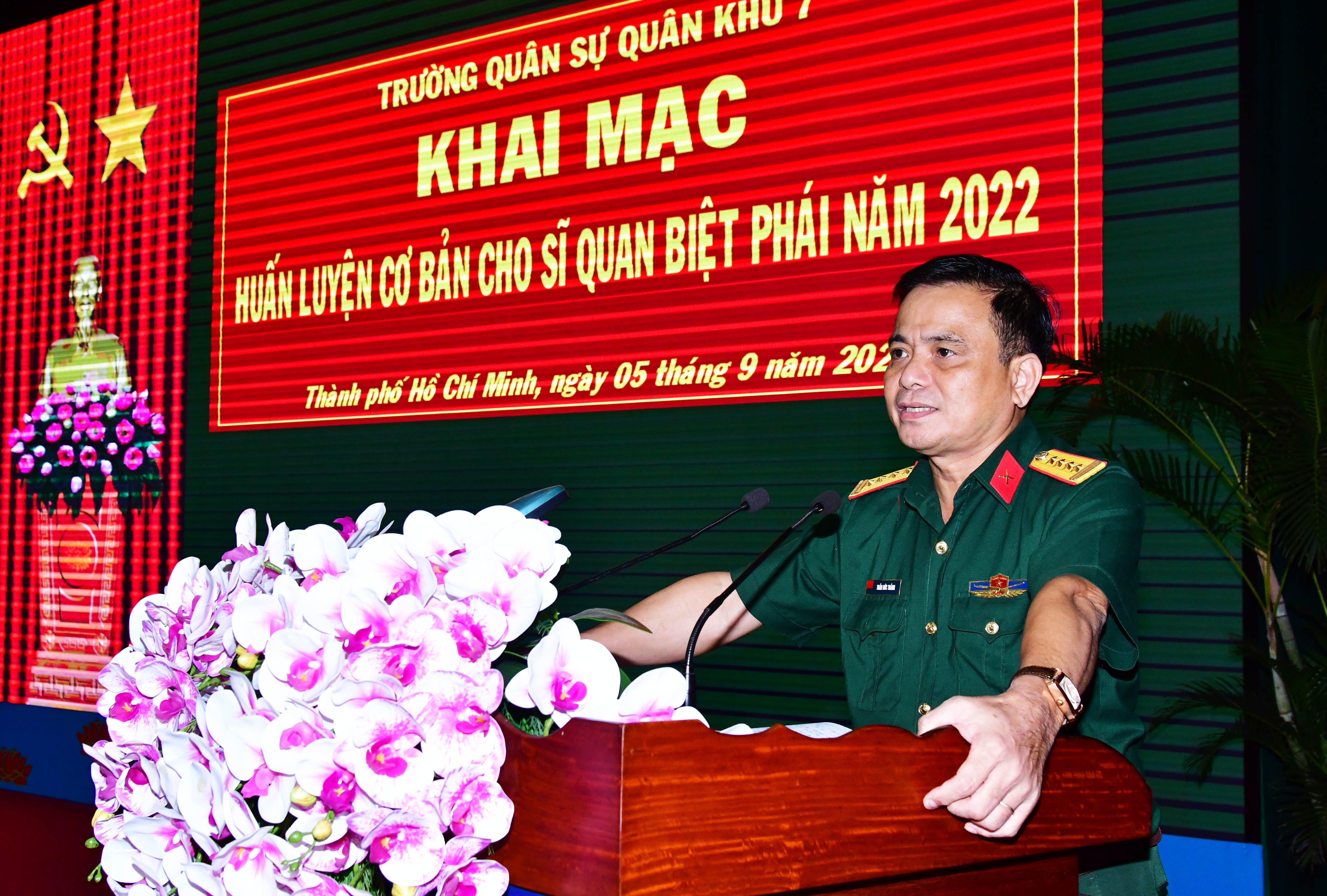 Đại tá Bùi Văn Dự, Phó Hiệu trưởng Trường Quân sự Quân khu 7 phát biểu khai mạc.