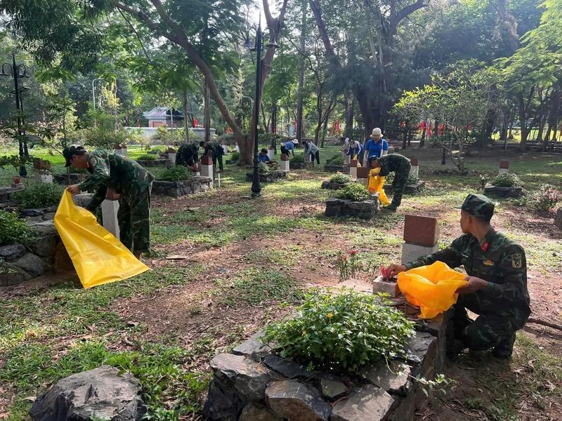 Chiến sĩ, đoàn viên thành niên làm sạch nghĩa trang.