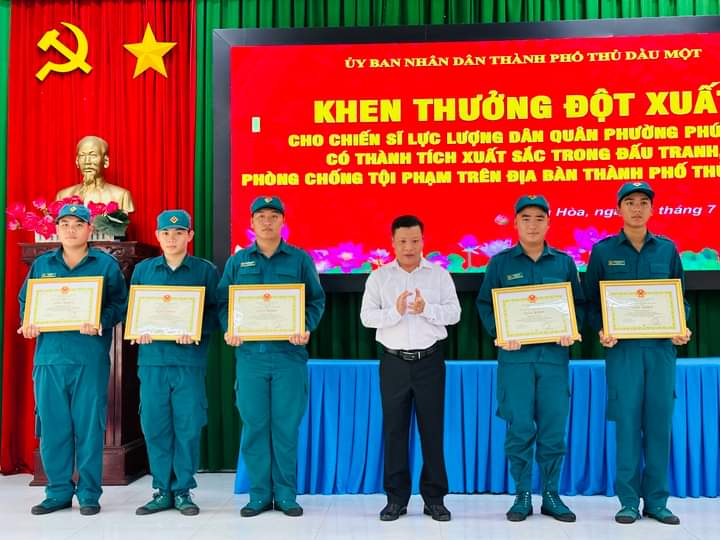 Đồng chí Trần Sĩ Nam, Phó Chủ tịch UBND thành phố trao thưởng cho các dân quân.