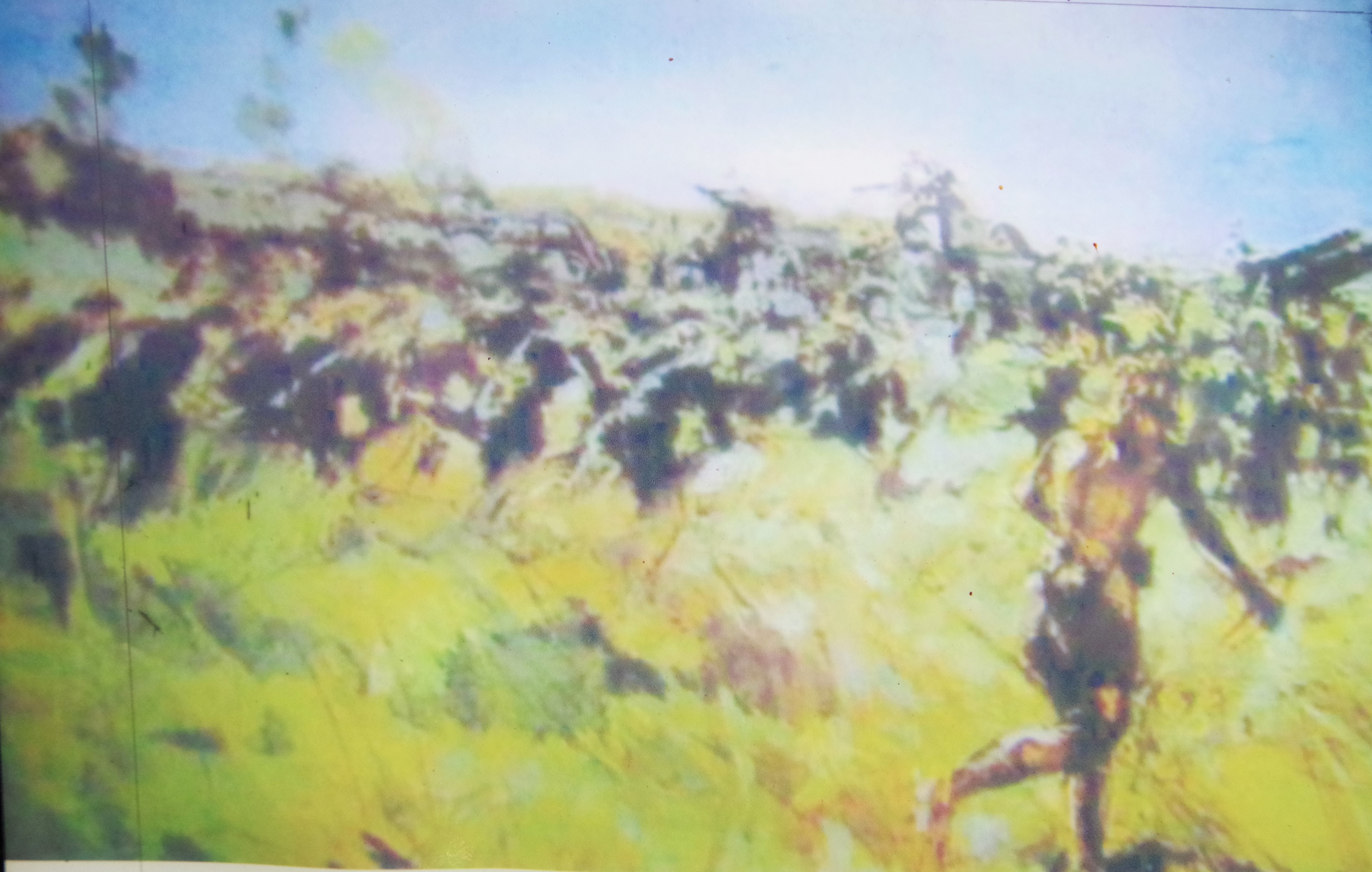 Tranh “Trận Tầm Vu” của họa sĩ Nguyễn Hiêm tại khu trưng bày.