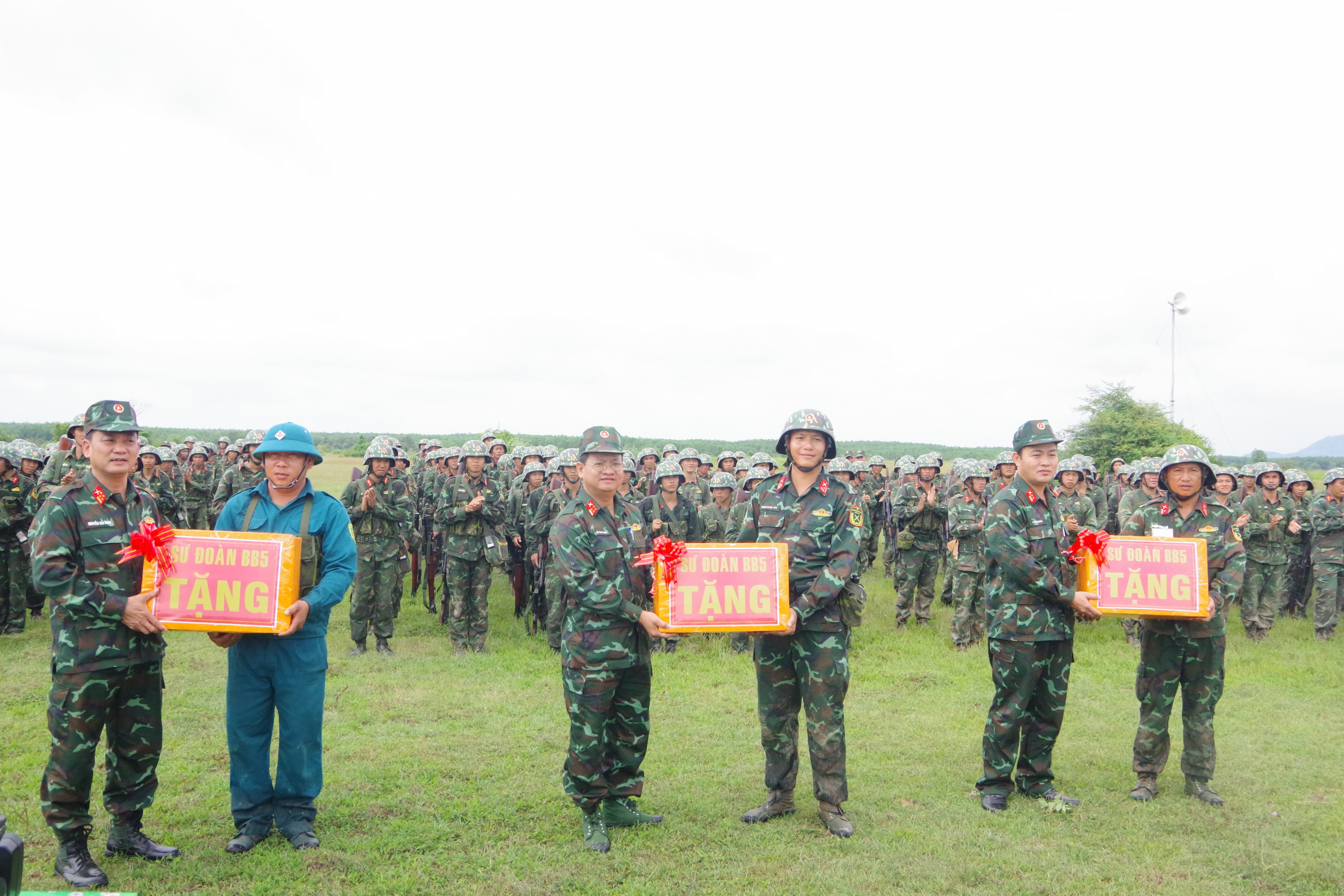 Thủ trưởng Sư đoàn 5 tặng quà chúc mừng các đơn vị hoàn thành tốt nhiệm vụ diễn tập. Ảnh: Lê Thuận