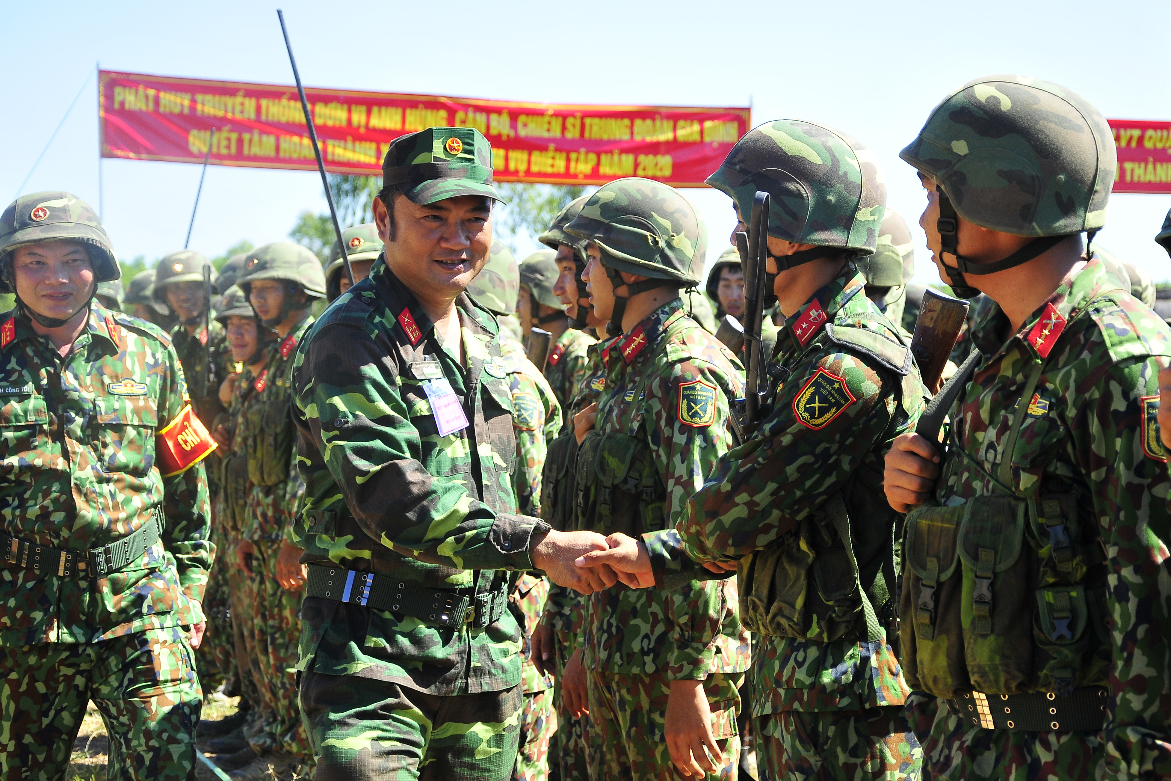 Đại tá Lê Xuân Thế, Phó Tư lệnh, Tham mưu trưởng Bộ Tư lệnh TPHCM động viên cán bộ, chiến sĩ Trung đoàn Gia Định tham gia diễn tập.