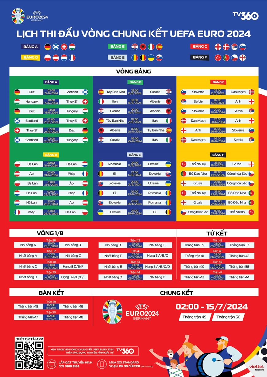 Lịch thi đấu vòng chung kết Euro 2024. Ảnh: Viettel