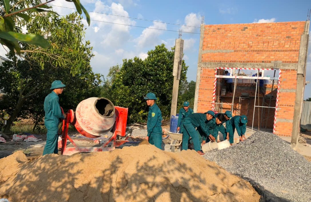 Dân quân thị xã Kiến Tường hỗ trợ Nhân dân xây nhà tại điểm dân cư liền kề chốt dân quân biên giới.