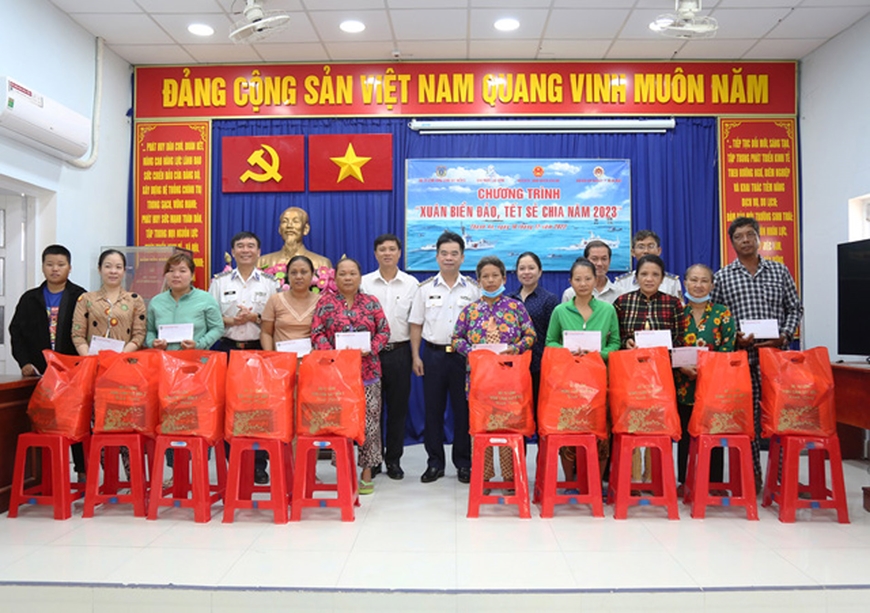 Đoàn công tác Vùng Cảnh sát biển 3 tặng quà ngư dân xã đảo Thạnh An, huyện Cần Giờ trong Chương trình "Xuân biển đảo, tết sẻ chia" năm 2023.
